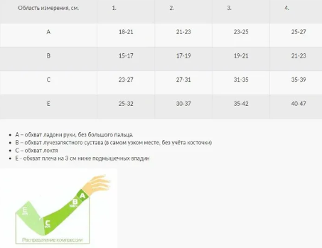 Надевать рукав рекомендуется утром, постепенно натягивая до полного облегания верхней конечности. Подбор размера изделия в соответствии с показаниями прилагаемой таблицы.